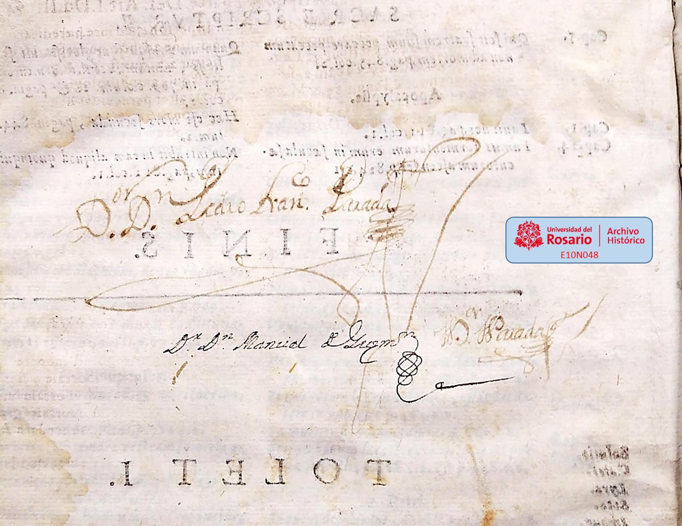 Volviendo al doctor Parada, se trata de Pedro Francisco de Parada Sáenz, a quien hemos rastreado usando nuestro catálogo de documentos. Fue catedrático de Filosofía (1725), maestro de ceremonias (1723), consiliario (1723-25) y vicerrector (1725-26)[3]. Estamos seguros de esta identificación pues, al final de la misma obra, aparece una firma que pone todos los nombres de Parada: