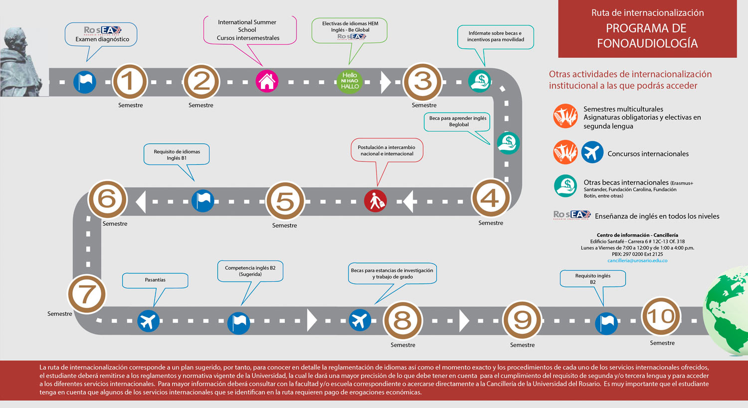 De acuerdo con la política institucional de internacionalización y con la estructura curricular de los programas de pregrado y posgrado en la Escuela de Medicina y Ciencias de la Salud, se han diseñado infografías particulares que buscan orientar al estudiante en la ruta sugerida para tener en cuenta el cumplimiento de requisitos de segundo idioma, oportunidades de cursar asignaturas en inglés o planificar sus semestres internacionales.