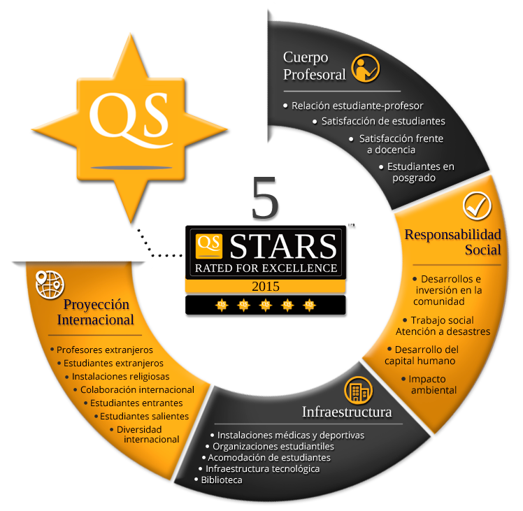 La firma calificadora británica Quacquarelli Symonds (Qs), reconocida por la publicación de los rankings de universidades a nivel mundial, desarrolló una metodología de evaluación internacional en siete grandes dimensiones, con el fin de brindar al público en general una visión comparada sobre el grado de consolidación institucional universitaria, conocida como Qs Stars.