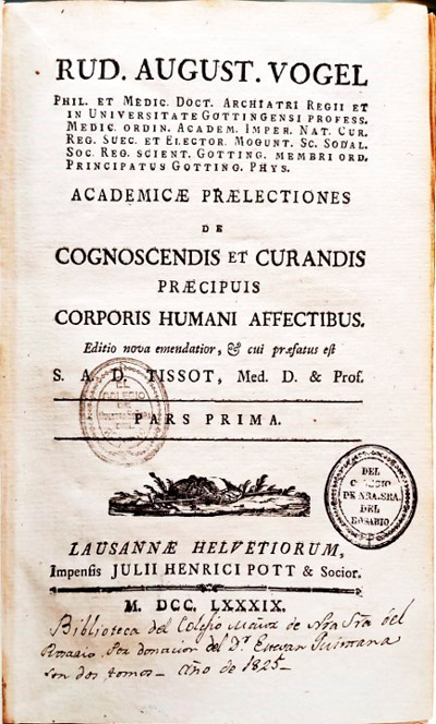 Vogel, Academicae praelectiones. Obra donada por Esteban Quintana, colegial de Medicina en 1803; consiliario y vicerrector, 1821-22.