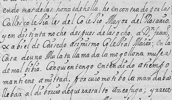 “He encontrado por las calles colegiales del Colegio Mayor del Rosario. Y en distinta noche después de las ocho a Don Francisco Javier de Caicedo asimismo Colegial Mayor; en la casa de una mulata llamada la mogollona mujer de mal vivir. Con quien tengo entendido a tiempo mantiene amistad, por cuyo motivo la mandaba llevar al divorcio de que resultó hacer fuga”.