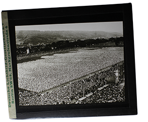 Turnfest en Stuttgart: Fotografía de un desfile en el Festival Gimnástico Alemán de Stuttgart, en 1933. Más de 200 mil personas asistieron al evento, que fue uno de los primeros en los que se empleó la propaganda nazi. Adolfo Hitler estuvo presente y se produjo material audiovisual de este evento.