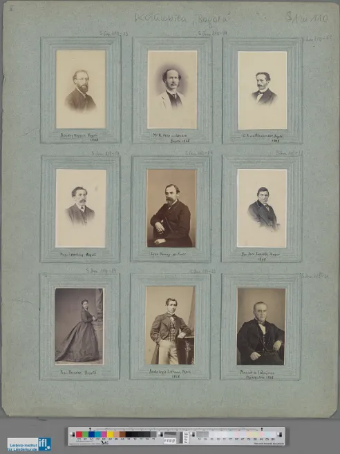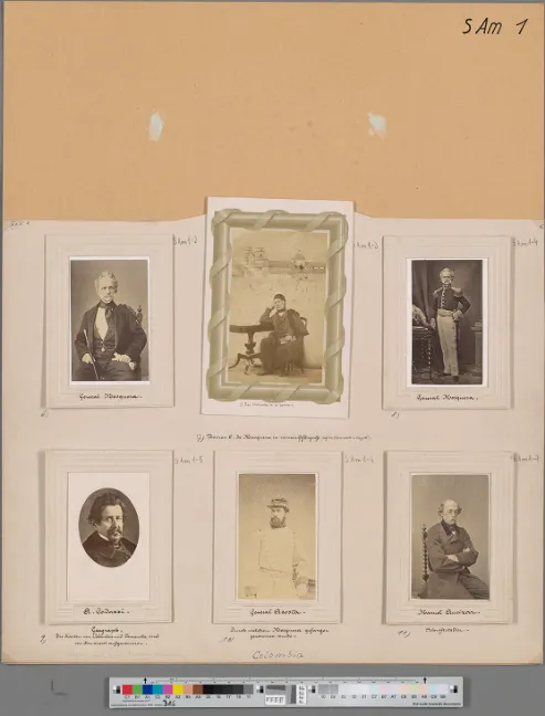 Descripción: Seis fotografías de personalidades colombianas puestas en un folio blanco recortado. Este folio está colocado a su vez sobre un cartón de color beige. Con los “retratos de élite” se quería mostrar a los políticos o eruditos que a mediados del siglo XIX pertenecían a la élite de los Estados Unidos de Colombia. Es importante advertir que en este grupo también se incluyeron los retratos de extranjeros con los que los dos geólogos alemanes tuvieron contacto durante su travesía por el país (Schuster y Neva, 2022, p. 130). Alphons Stübel montó en folios de cartón la mayor parte de las fotografías adquiridas en el territorio colombiano, por compra o donación, con el objetivo de exponerlas en el Museo de Geografía comparada, localizado en la ciudad alemana de Leipzig, el cual fundó en 1896. Cabe mencionar que este museo fue cerrado en 1975 (Schuster y Neva, 2022, pp. 34-35).