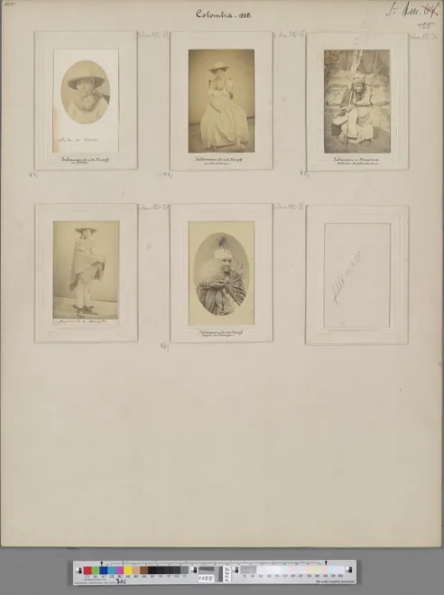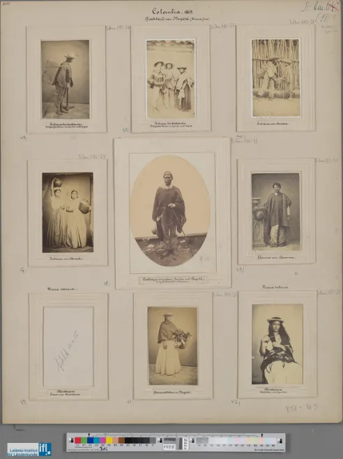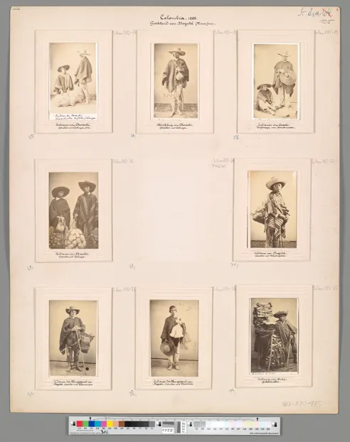 Descripción: Nueve “Fotografías de tipos” puestas sobre un folio blanco. Alphons Stübel montó en folios de cartón la mayor parte de las fotografías adquiridas en el territorio colombiano, por compra o donación, con el objetivo de exponerlas en el Museo de Geografía comparada, localizado en la ciudad alemana de Leipzig, el cual fundó en 1896. Cabe mencionar que este museo fue cerrado en 1975 (Schuster y Neva, 2022, pp. 34-35).