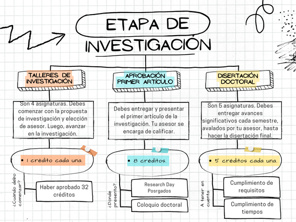 La Disertación doctoral está compuesta por 37 créditos que se distribuyen a lo largo de 4 años, el proceso de la etapa de investigación es el siguiente: