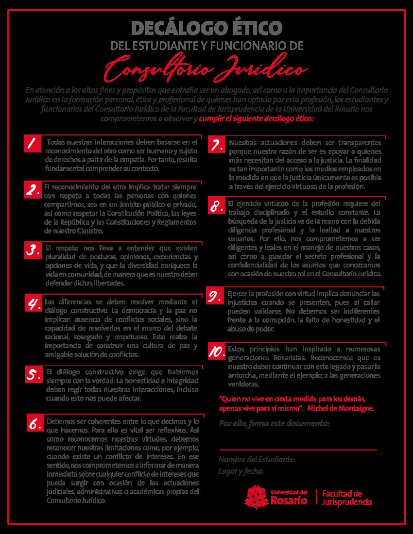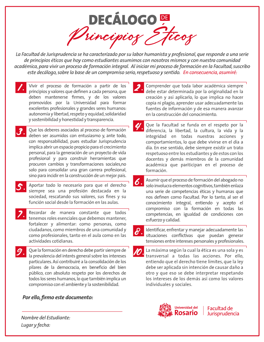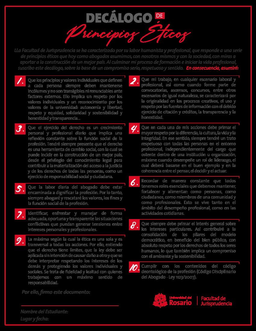 El Decálogo fue construido de manera participativa y deliberativa entre todos los miembros del Comité de Ética de la Facultad. El documento consta de diez principios éticos que le permiten al estudiante generar una reflexión y una consecuente concientización de la importancia que tiene la profesión de abogado y los deberes que implica la formación legal. De la misma manera, el Decálogo destaca los valores y la integridad, como parte esencial de dicha formación y de la función social del programa de Jurisprudencia.