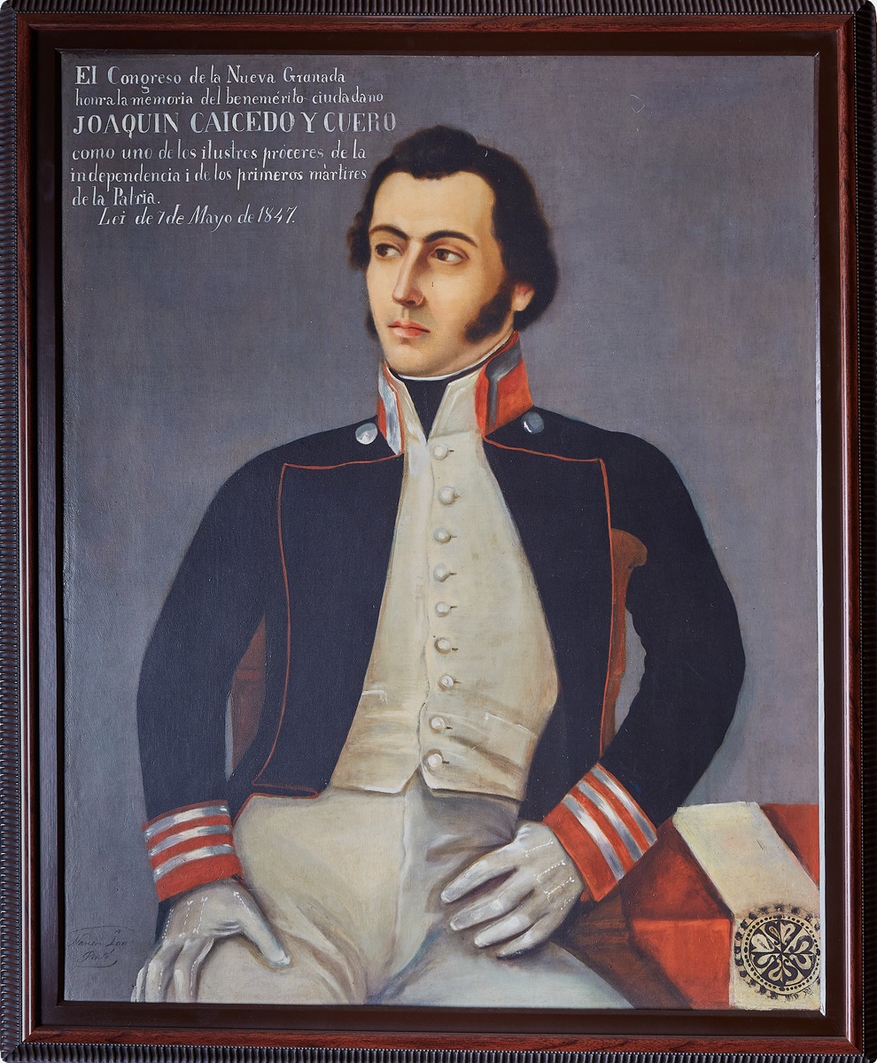 Formato vertical. Figura de ¾, frontal, sedente, cabeza de medio perfil. Patillas largas, brazo derecho apoyado en el muslo, el izquierdo a la altura de la cintura, el dedo pulgar se introduce en el bolsillo del pantalón. Uniforme militar: chaquetilla negra abierta, solapas anchas, borde dorado. Sobre los hombros cerca al cuello, botones dorados. Cuello militar y puños en rojo, con tres listas horizontales en color plata. Camisa blanca, alzacuello negro, pantalón blanco. Lado derecho: mesa color rojo, sobre ella beca blanca de colegial. Lado izquierdo: ángulo superior, inscripción en letra cursiva, color blanco: "El Congreso de la Nueva Granada / honra la memoria del benemérito ciudadano / Joaquín Caicedo y Cuero / como uno de los ilustres próceres de la / independencia i de los primeros mártires / de la Patria. / Lei de 7 de Mayo de 1847".