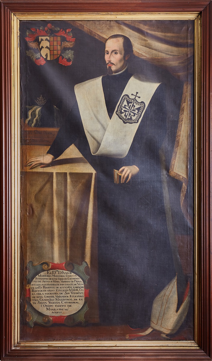 Juan de Mosquera Nuguerol, natural de Mariquita, fue colegial de primera fundación, catedrático y dos veces rector (1666-67, 1673-76). No aceptó la designación para obispo de Manila, por lo cual la mitra está a sus pies.