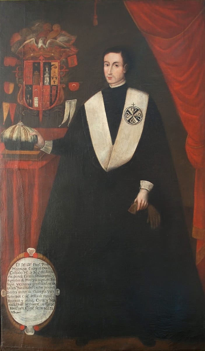 Formato vertical. Figura de frente, de cuerpo entero, sentado, levemente girado a su derecha. Lleva alzacuello blanco, sotana negra, beca blanca de colegial a su izquierda; mano izquierda apoyada al brazo de la silla, birrete en su derecha. En la parte superior derecha, escudo de forma española, cuartelado, partido. Cantón diestro del jefe, campo en gules con dos canastos en oro, campo en sable con torre en oro y estrella en oro. Cantón siniestro del jefe, campo en sable con torre en plata, campo en amarillo con dos coronas en oro y tres flores de lis. Cantón diestro de la punta, campo en sable con tres torres en oro, campo en gules con luna en oro. Cantón siniestro de la punta, campo en gules con flor de lis, campo en sable con figura sin determinar en gules. Timbrado con corona, palomas y lambrequines en gules y plata.