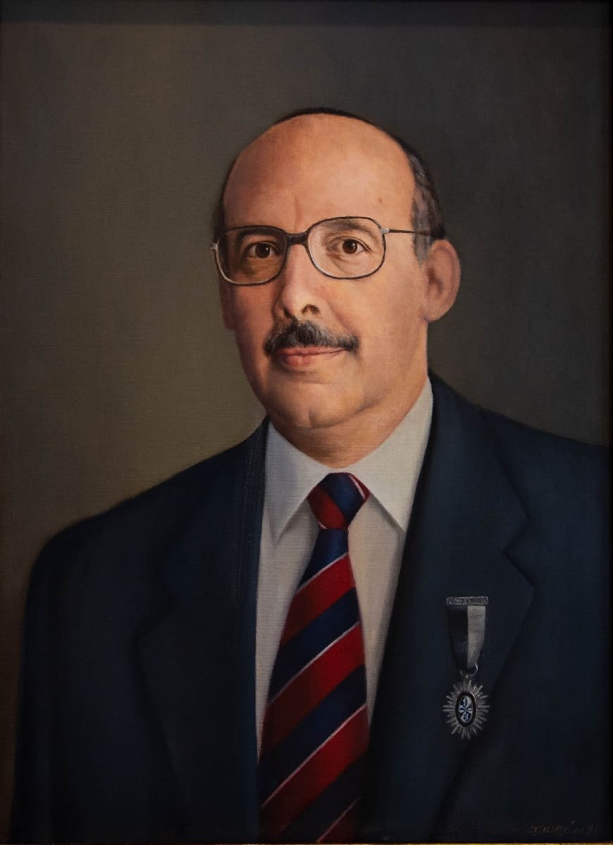 Busto, de frente y ligeramente volteado hacia la derecha del espectador. Luce medalla de colegial sobre saco negro, corbata a rayas rojas, azul oscuro y amarillo. Hombre de frente prominente, luce anteojos de arco negro y bigotes.