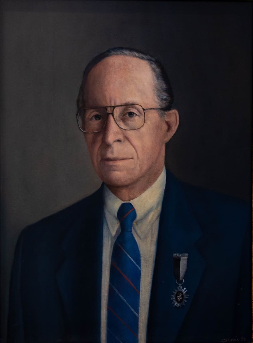 Busto de frente y ligeramente volteado hacia la derecha del espectador. Luce medalla de colegial sobre saco de color oscuro. Viste corbata azul oscuro con rayas delgadas de color rojo y blanco. Notorias marcas faciales, hacia la boca. Ojos de color oscuro. Anteojos con arco negro. Frente ancha y prominente. Labios delgados. El fondo de la pintura es gris oscuro, aclarándose hacia el costado izquierdo.