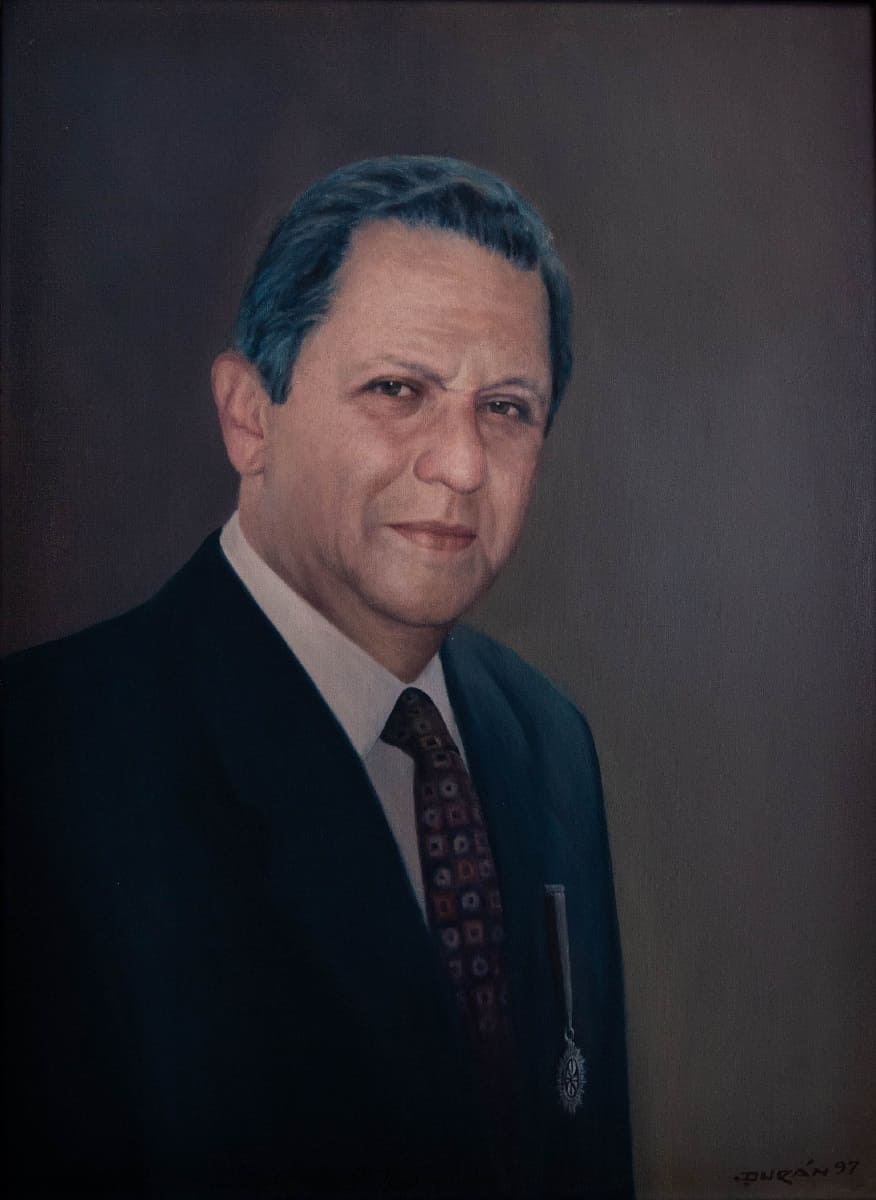 Hombre representado de busto. Frente ancha, cabello negro, nariz ancha, labios finos, barbilla aguda, ojos claros. Viste camisa de cuello blanco y corbata con diseños sobre fondo negro. Saco negro en cuya solapa aparece la medalla de colegial. Figura mirando en posición de tres cuartos, girada hacia la izquierda del observador. El fondo de la obra es de color gris claro. Firmado costado derecho inferior J. Durán.