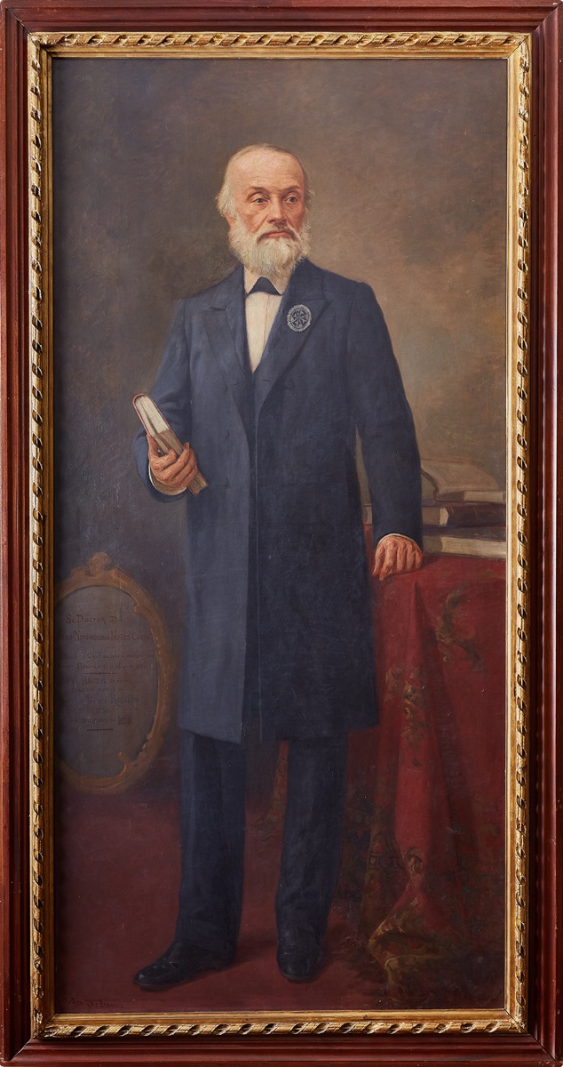 Formato vertical. Figura de cuerpo entero, frontal, de pies, cabello, barba y bigote blanco. Traje de levita y chaleco gris oscuro; en la solapa izquierda, escudo del Colegio de Nuestra Señora del Rosario. Camisa blanca, cuello de pajarita y alzacuello negro. Zapatos negros. Brazo derecho a la altura de la cintura, sostiene libro de tapas rojas entreabierto por el dedo índice. Lado izquierdo: cartela ovalada.