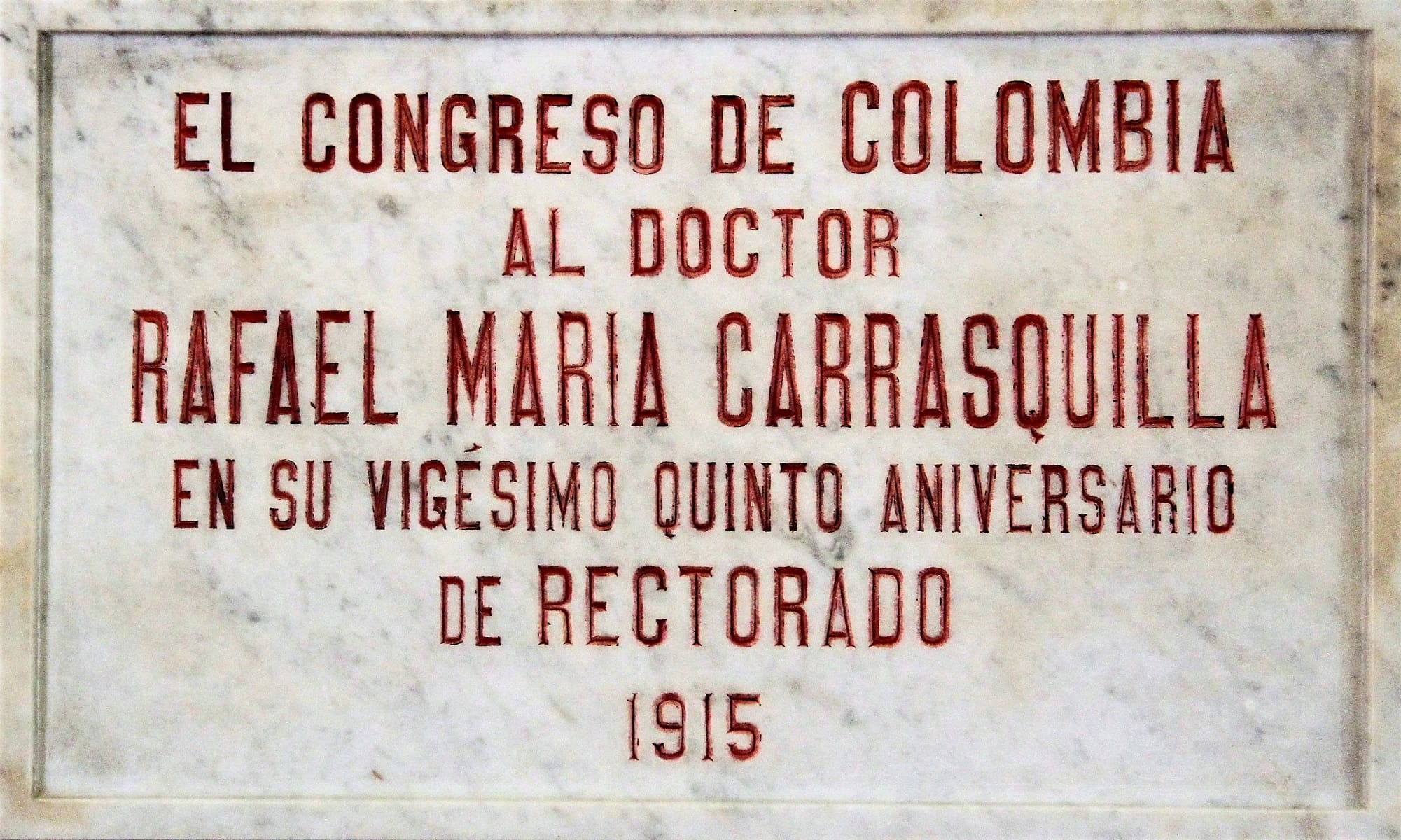 Rafael María Carrasquilla (1857-1930), bogotano, inició los estudios en el colegio de su padre, don Ricardo Carrasquilla. Continuó en el Seminario Conciliar, donde se ordenó. El presidente encargado, Carlos Holguín, lo nombró rector del Colegio Mayor, en 1890. Los presidentes de la República lo ratificaron sucesivamente en su cargo hasta 1930, año de su muerte.