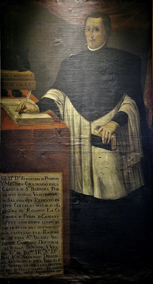 Fernando de Pedrosa y Meneses, según cuenta la cartela, se graduó en la capilla de Santa Bárbara por la Universidad de Salamanca, donde enseñó y publicó sus obras. En el Rosario, fue catedrático de prima de Cánones por nueve años, "en que logró sacar discípulos muy doctos".