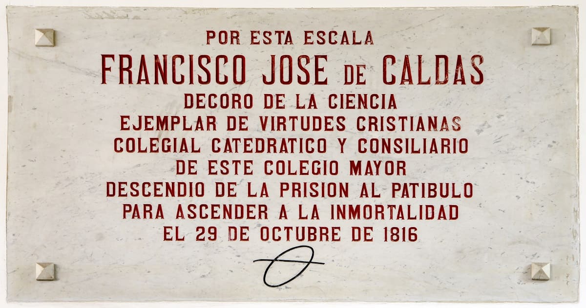 Francisco José de Caldas (1768-1816), natural de Popayán, se formó en este Colegio Mayor, cuya beca vistió en 1788. Bachiller en Filosofía y Derecho canónico, sería luego catedrático, en ausencia de Mutis. Por sus variados conocimientos se le ha llamado “Sabio” y las circunstancias lo hicieron prócer y mártir.