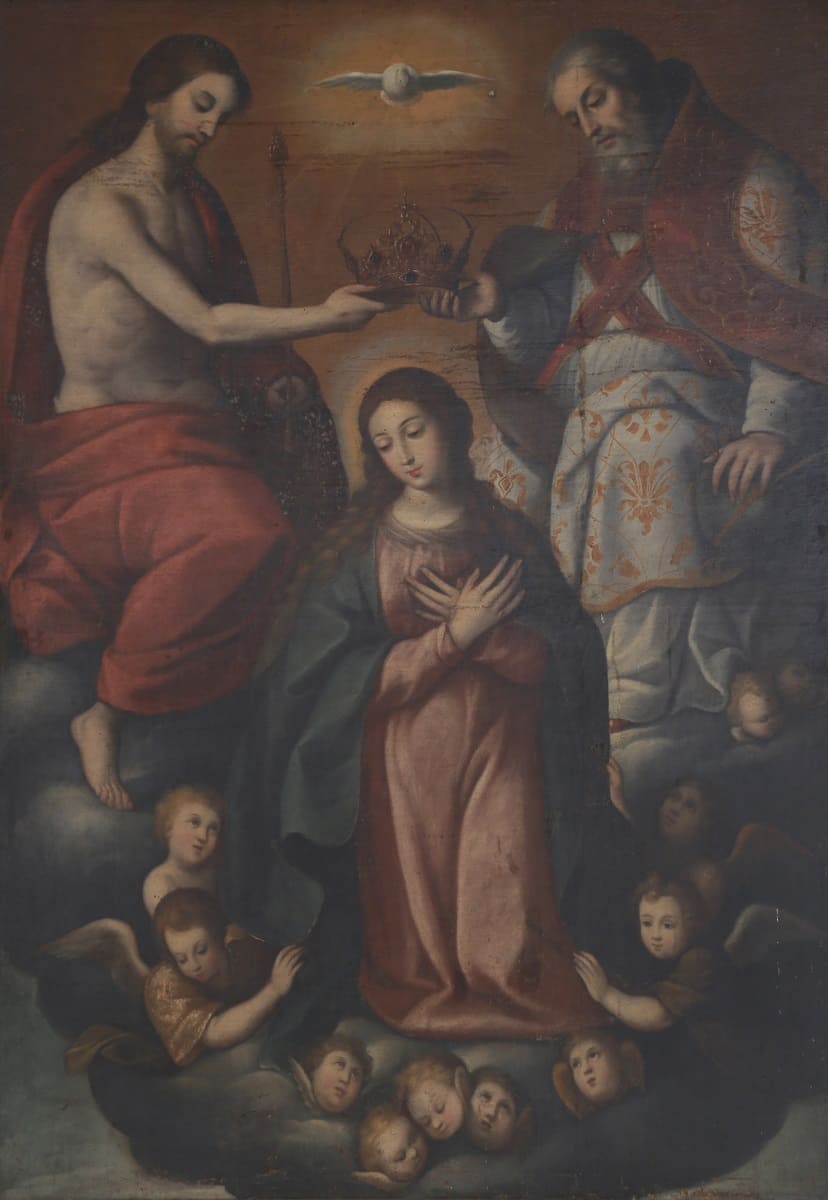 Una de las obras más importantes de la colección, representa la coronación de la Virgen por la Santísima Trinidad. De los mejores trabajos de Figueroa, a partir de un grabado de una famosa obra de Rubens.