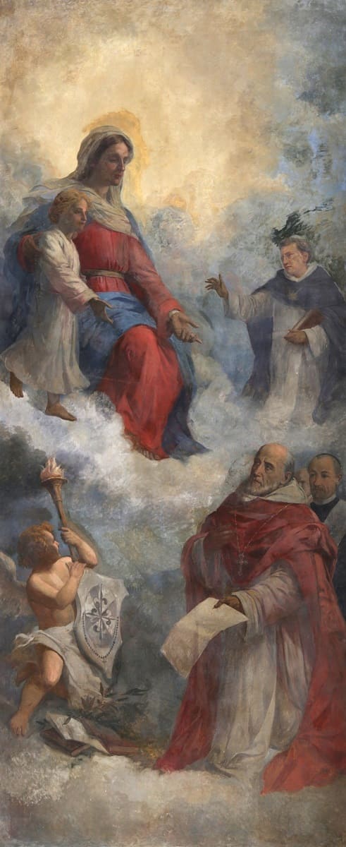 Representa a la Virgen con Jesús niño, ante quienes el arzobispo fray Cristóbal de Torres y Motones presenta la fundación de su colegio. Cerca de María está santo Tomás de Aquino, cuya doctrina fue base del Colegio. Detrás del señor Torres, aparece el rector Masústegui, considerado como un segundo fundador. Completa la composición la alegoría del estudio y la fe, en la forma de un ángel sostenedor del escudo del Colegio y de una antorcha encendida.