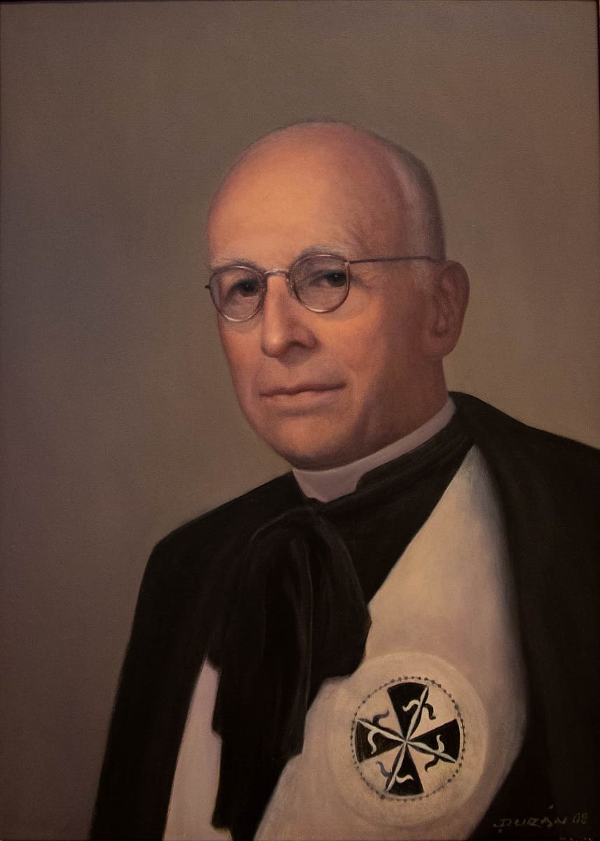 Formato vertical. Representado de medio cuerpo, en posición frontal, ligeramente girado a la derecha. Lleva anteojos; viste alzacuello, sotana, abrigo y beca blanca de colegial.