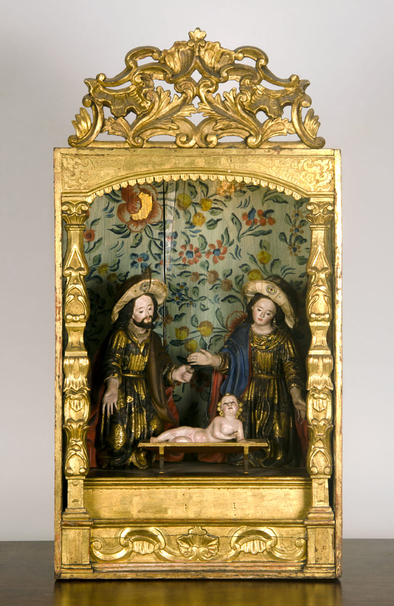 La Virgen, san José y el niño Jesús se encuentran en una urna, pintada con motivos florales en rojo, azul, verde y naranja; fondo color verde agua. Las figuras de san José y la Virgen llevan vestidos esgrafiados y policromados. Ambos llevan sombrero de la época, adornado con plumas. Se encuentran con los brazos extendidos en contemplación del niño Jesús, quien reclinado sobre una pequeña tarima en madera mira hacia el frente. La urna presenta dos columnas talladas, a lado y lado del frente; copete en madera calada y con hojilla de oro, puerta posterior. El motivo floral del interior se repite en el techo y en los costados externos de la urna. Al frente, vidrio corredizo que facilita su observación.