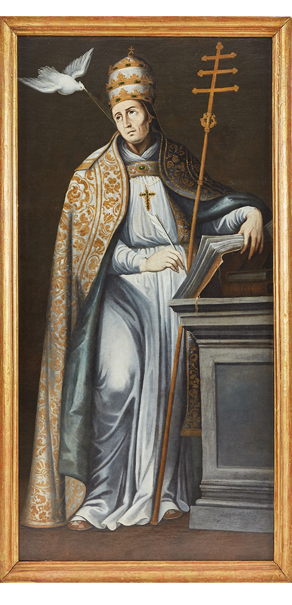 Formato vertical. Figura de pie, cuerpo entero, de frente, cabeza girada a su derecha. Viste ornamentos pontificales, tiara, pectoral, capa brocada, bordón de doble travesaño apoyado en el pedestal que está a su izquierda. En la mano derecha, lleva una pluma en actitud de escribir; con la izquierda, sostiene un libro abierto que esta sobre el pedestal. Detrás, otro libro cerrado. Ángulo superior izquierdo, la paloma del Espíritu Santo.