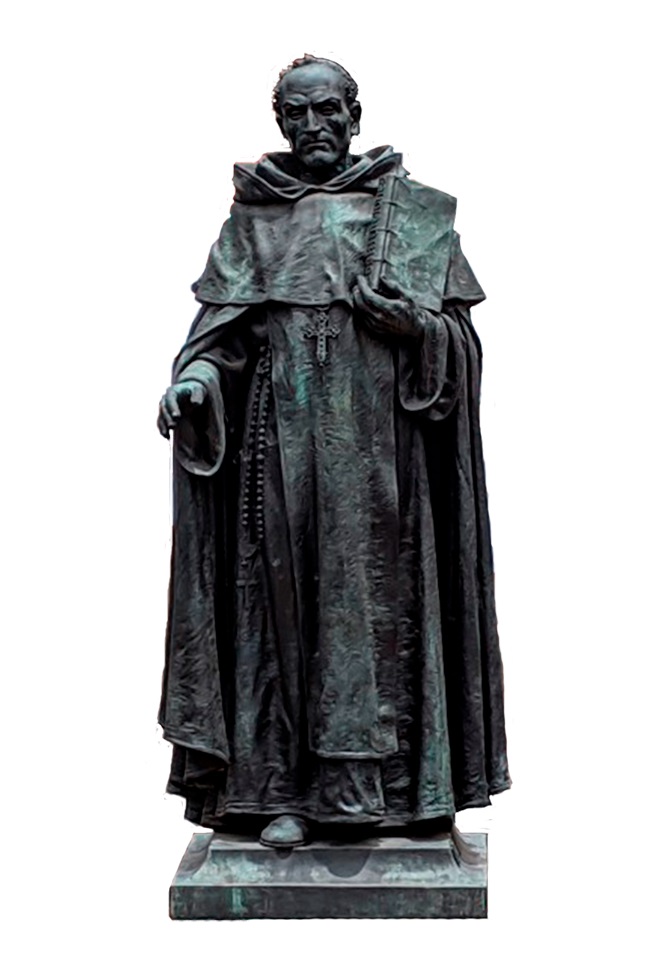 Figura pedestre. Viste hábito de dominico, escapulario, esclavina, capuchón y capa ancha larga con capucha. El brazo derecho extendido al frente. El izquierdo, flexionado a la altura del costado, sostiene el libro de las Constituciones de su Colegio Mayor, el cual descansa sobre el hombro izquierdo. Sobre el pecho, una cruz latina con remates en flor. Del cíngulo, en el costado derecho, pende el rosario. Forma una sola pieza con la peana, sobre la que se lee la inscripción: “Fundición artística F. Cescati - Barcelona”. La escultura se halla montada sobre un pedestal rectangular, renacentista, en piedra, con un escudo de armas en cada una de sus caras. Cara frontal: escudo del Colegio del Rosario, diseñado por Renart. Cara posterior: escudo arzobispal. Cara lateral derecha: escudo de España. Cara lateral izquierda: escudo de Colombia.