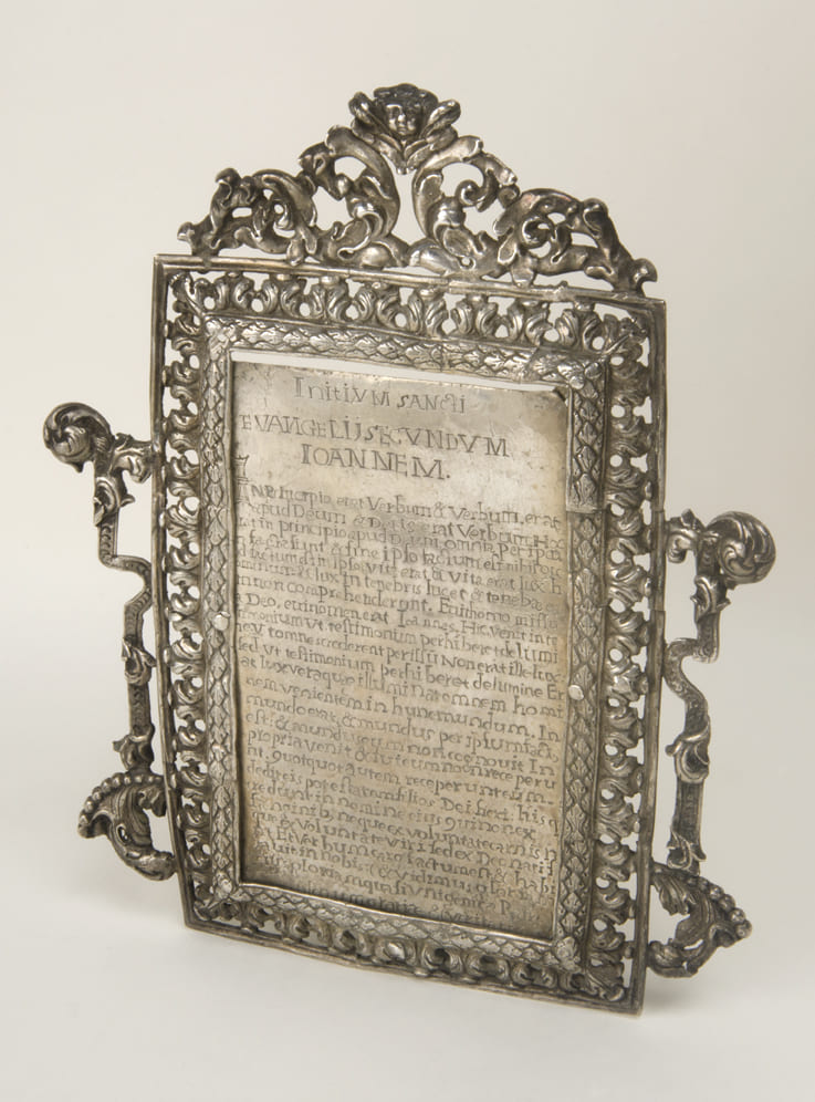 Formato vertical, monoaxial. Texto latino del Evangelio de Juan, en veinticinco renglones. Marco: cinta interior en hojas romboidales. Decoración exterior calada, en hojas, imitación de flor de lis. Borde recto. Remate calado, con motivos vegetales, borde mixtilíneo, querubín en la parte superior. Laterales: banda decorativa calada, con arabescos.