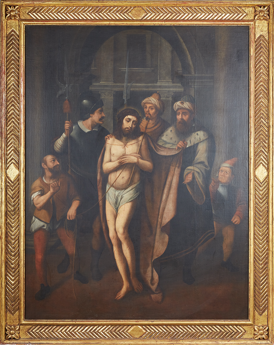 Formato rectangular vertical. Centro primer plano: Cristo de pie, con la pierna izquierda levemente flexionada y las manos superpuestas sobre el tórax; con la derecha sostiene una caña. Marcas de latigazos en el cuerpo. Cabeza levemente girada a su izquierda, cabello castaño al hombro, coronado con espinas, mirada hacia abajo, nariz recta, barba redondeada. Viste manto café, atado al cuello con una cuerda delgada y perizoma blanco. A su derecha, un enano, de perfil derecho, que mira a Jesús, cabello y barba cortos, saco de manga corta ocre, jubón blanco y calzas rojas, zapatos negros; su mano derecha hace un gesto y con la izquierda tiene enrollada la cuerda de la capa. A su izquierda un soldado de pie, perfil derecho, tez clara, cejas pobladas y bigote negros. Casco morrión, camisa blanca, coraza, faldilla y botas cafés. Con la mano derecha sostiene una alabarda, la mano izquierda sobre el hombro derecho de Jesús. Detrás, a la izquierda de Jesús, un hombre levemente girado a su derecha. Lleva gorro ocre con turbante blanco, ojos cafés, barba estilo imperial, manto ocre. Sostiene en su mano derecha una lanza. A su izquierda, hombre de pie, con gorro azul con líneas doradas y turbante blanco, al centro broche dorado y piedra azul. Tez clara, ojos y barba larga poblada. Viste túnica a media pierna con dos líneas doradas en el orillo; mangas anchas blancas, manto de armiño y botas café. Con la mano izquierda sostiene levantado el manto de Jesús. Al extremo derecho, un enano, de pie, con la pierna izquierda adelantada. Su cabeza girada hacía Jesús. Lleva gorro alto rojo con borde blanco, tez clara, ojos cafés, nariz aguileña, boca pequeña cerrada. Camisa blanca, chaleco gris y mangas rojas, calzas ocres y zapatos negros. Con el dedo índice de su mano izquierda señala a Jesús. Al fondo, una arquitectura enmarcada por un arco. Suelo terracota.
