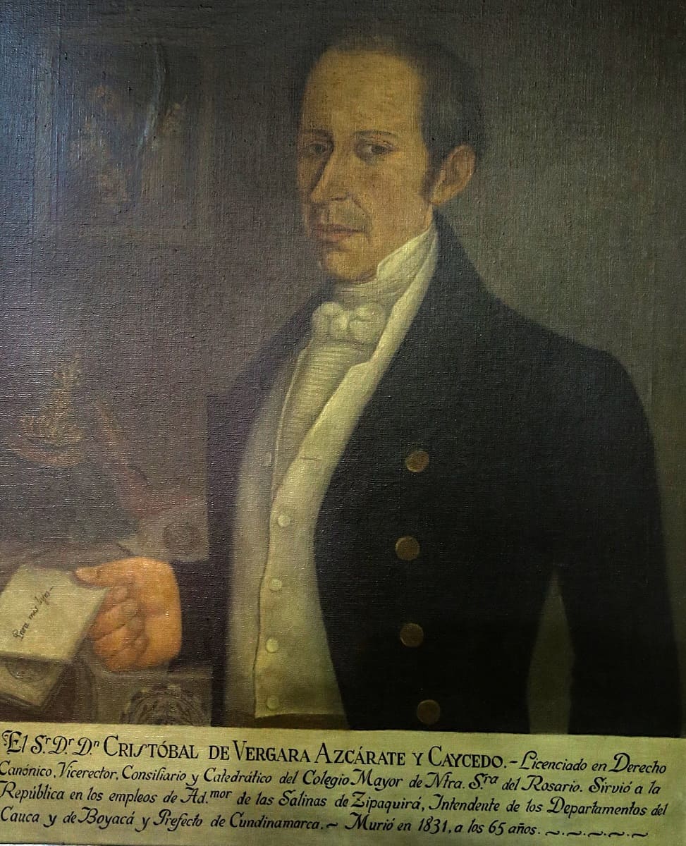 Cristóbal de Vergara y Caicedo (1766-1831), natural de Santafé, vistió la beca de colegial del Rosario, en 1781, y alcanzó los grados de bachiller en Filosofía (1783) y en Derecho civil (1784); bachiller, licenciado y doctor en Cánones. En el Colegio, sirvió los empleos de catedrático, procurador, consiliario y vicerrector; tuvo asimismo un amplio servicio público.