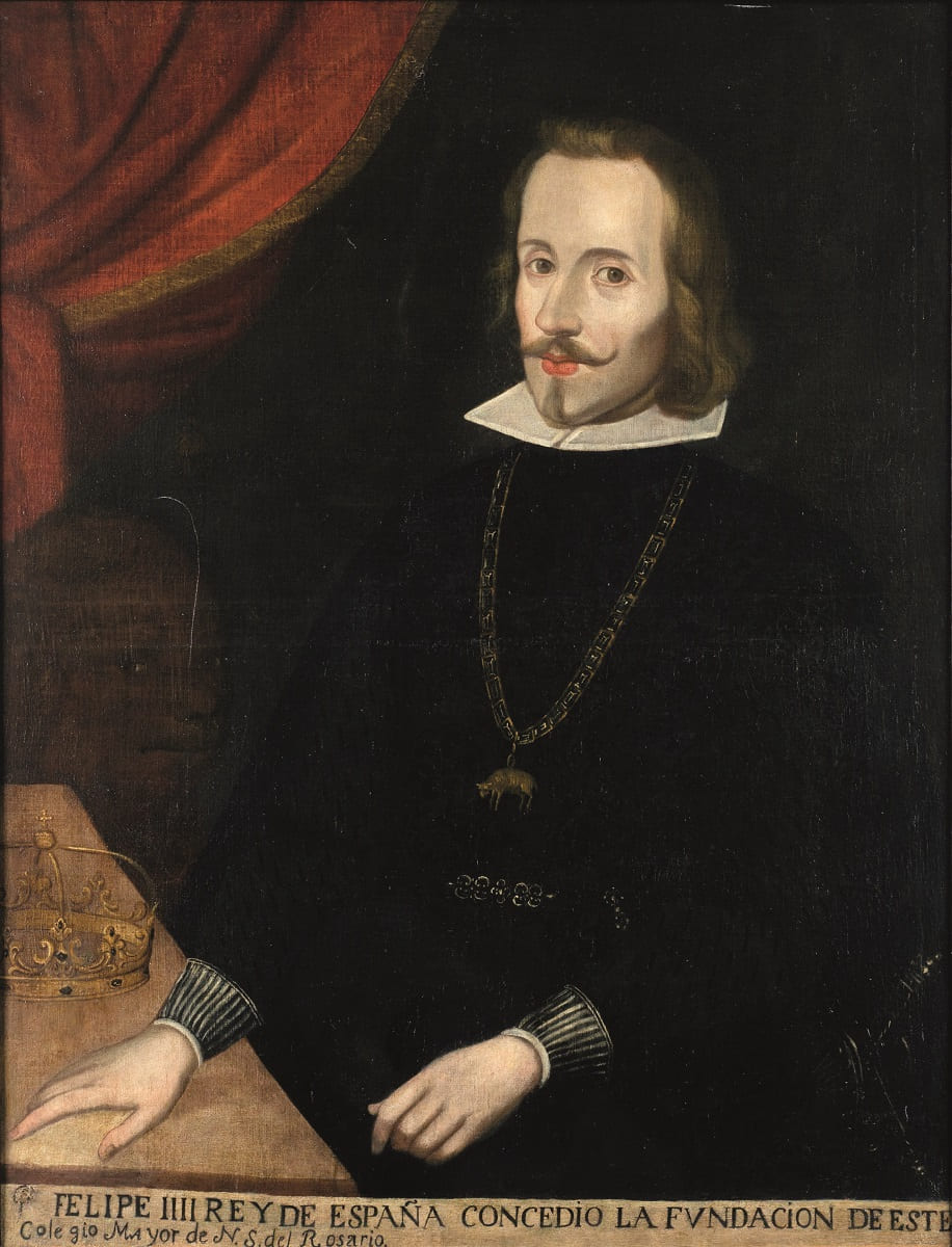Formato vertical. Figura de medio cuerpo, frontal, ligeramente girada a la derecha, sedente, cabello a la altura de los hombros. Frente ancha, bigote y chivera. Brazo derecho extendido, la mano descansa sobre una mesa situada al mismo lado. Brazo izquierdo a lo largo del cuerpo, la mano reposa sobre la pierna. Traje negro, manga larga, gorguera blanca plisada en cuello y puños. Cinturón de eslabones de oro, gorguera blanca, orden del toisón de oro (piel de cordero) que pende de una cadena de eslabones, orden y cadena de oro. Lado izquierdo: mesa, sobre ella corona real potenciada. Ángulo superior: cortinaje color rojo, borde ocre recogido. Parte inferior de lado a lado, cartela rectangular.