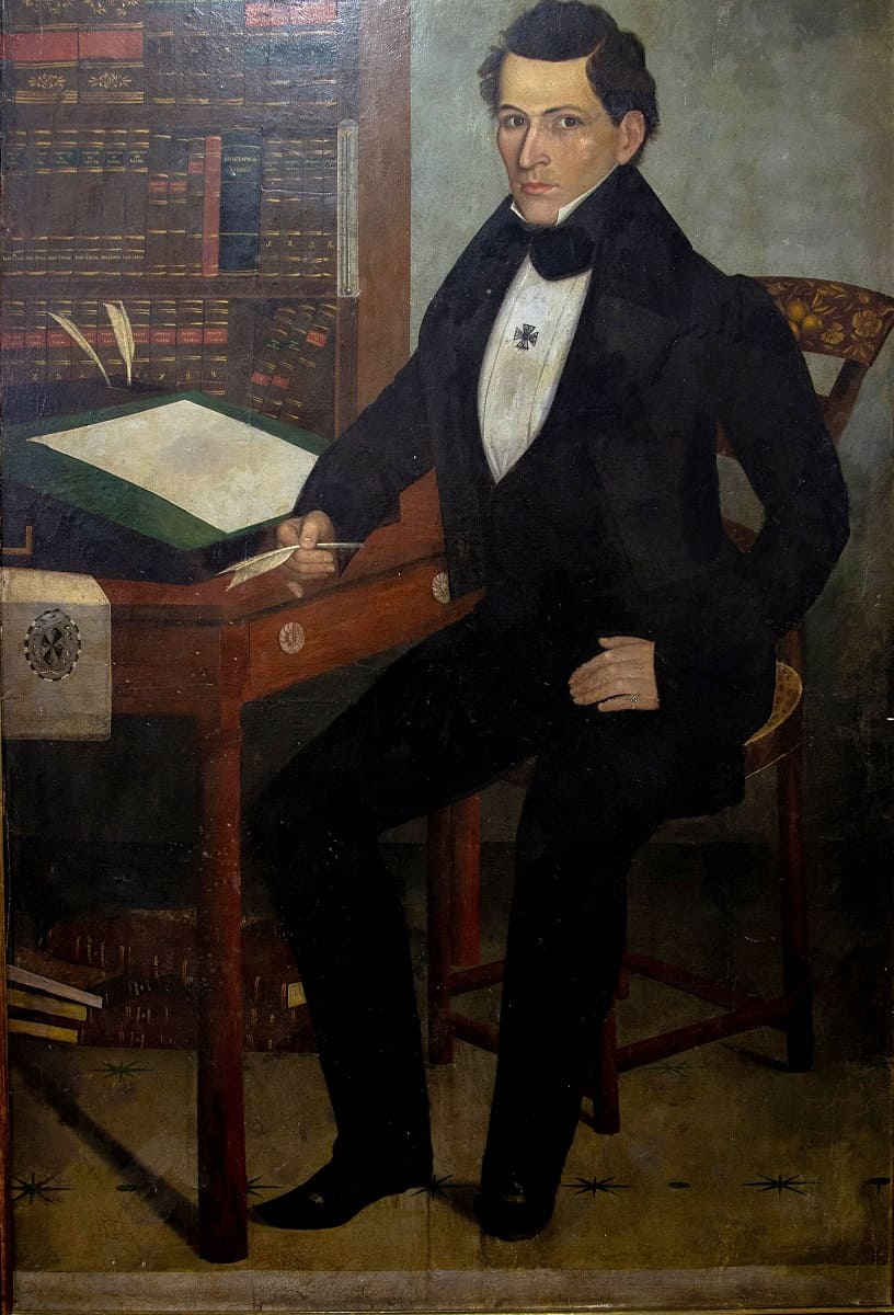 Formato vertical. Figura de cuerpo entero, sedente, ligeramente girada a la izquierda. Frente ancha, cabello largo; viste casaca negra y chaleco de igual color, camisa blanca con pechera y cruz al centro; cuello alto, escote en V. El brazo izquierdo sobre la pierna, mientras el derecho descansa sobre el escritorio, donde se ven útiles de escritura y la beca de colegial; la mano agarra una pluma. Detrás y debajo del escritorio están los libros de su biblioteca.