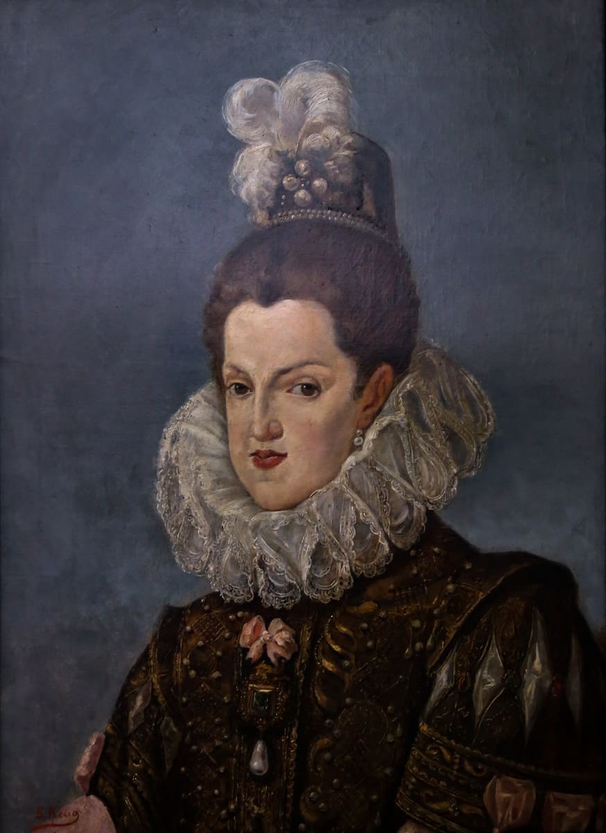 Formato vertical. Figura de torso frontal, ligeramente girada a la derecha, gorguera en encaje blanco. Vestido en brocado ocre oscuro, rebordado con perlas en formas de lágrima, abertura delantera rematada en la parte superior por un laso color rosa. Mangas dobles: sobremangas japonesas y mangas cortas de campana, acuchilladas en la parte superior, recogidas en la parte central por pequeñas rosas que hacen más amplio el acuchillado y dejan ver el fondo en seda blanca. En la parte inferior, una franja horizontal con aplicaciones, que sobresalen, en la misma seda. Debajo de las mangas, sale una manga blanca. Tocado tipo tunecino, con plumas blancas; al frente, cuatro perlas grandes en cruz, rematadas con una piedra central; dos hileras de perlas pequeñas bordeando el tocado. Aretes pequeños de diamante y, en el pecho, prendedor rectangular; montura labrada en oro con aguamarina. De la parte inferior pende una perla blanca en forma de lágrima.