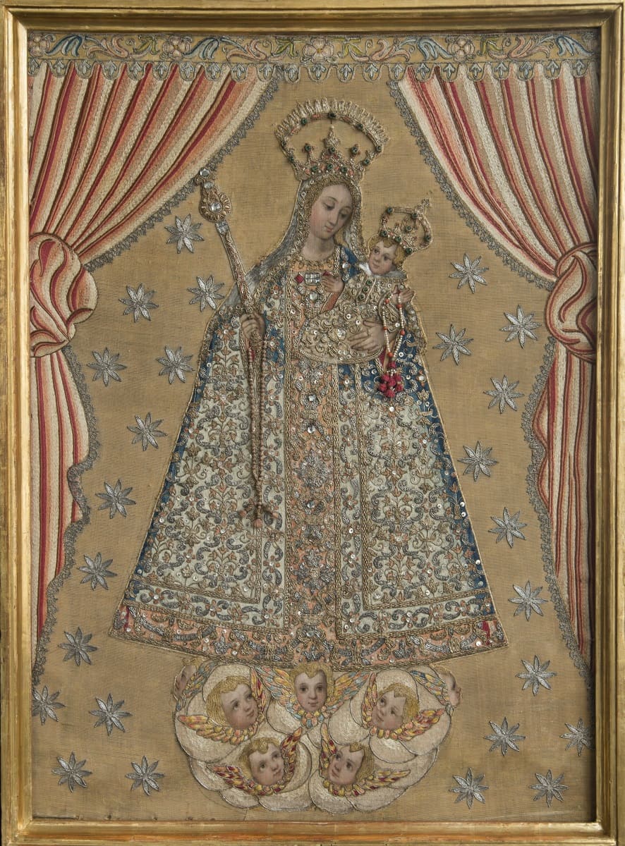 Formato rectangular vertical. Al centro de un fondo beige con 25 estrellas plateadas, la Virgen María de cuerpo entero, posada sobre una nube con cinco querubines. Porta una corona real con 10 piedras verdes y 8 perlas; cabello rubio, tez clara, mejillas sonrosadas, nariz y boca pequeña; sus ojos entrecerrados miran al Niño que carga en el brazo izquierdo. Viste manto plateado con ribete de encaje dorado, túnica triangular azul claro con ribete central y orillo inferior beige, todo bordado con hilos metálicos con formas florales. En su mano derecha, sostiene un cetro que remata con un adorno circular; el mango tiene decoraciones naranjas. Sujeta un rosario de nudos, que termina en tres cabos. El Niño está sentado, de brazos abiertos, mirando a su Madre. Porta una corona real con 6 piedras verdes y 4 perlas; cabello corto rubio. Viste capa de cuello alto y túnica beige con bordados florales, manga ancha. En su mano izquierda, sostiene un rosario con perlas y borlas rojas. Cortinas de rayas verticales en tonos rojos, beige y naranja, recogidas en un moño al centro, con encaje en los bordes, flanquean a la Virgen.
