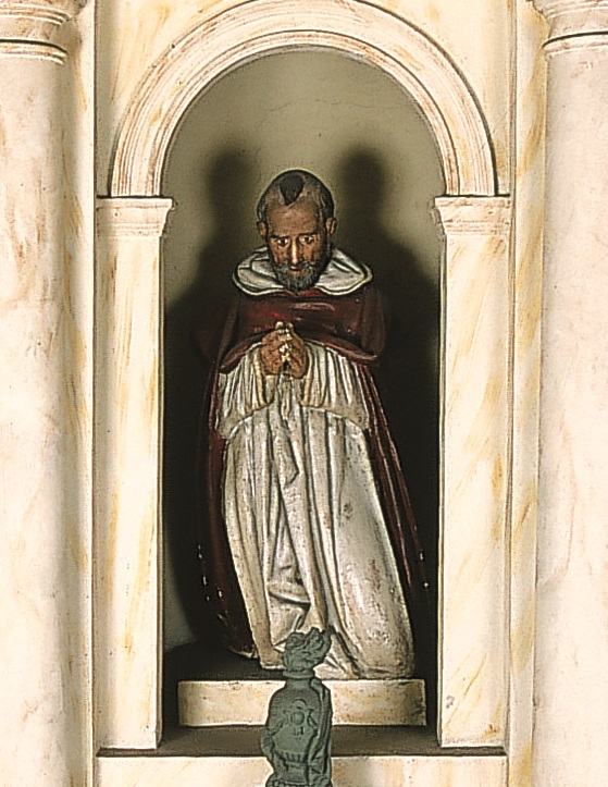 Escultura de bulto redondo. De cuerpo entero, de frente, cabeza inclinada hacia adelante, manos en actitud orante. Viste hábito blanco y capa con capuchón rojo (Orden de Predicadores). Se encuentra en un monumento funerario.