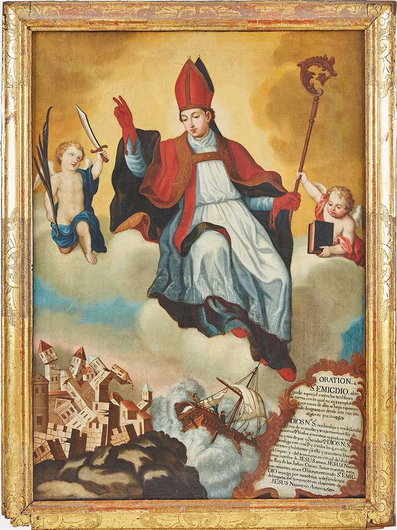 Formato rectangular vertical. Centro: san Emigdio, sentado entre nubes; de cuerpo entero, de frente, mirando a la tierra. Enguantado, mano derecha en actitud de bendecir, con la izquierda sostiene el báculo; lleva mitra, alba sobre el hábito y capa pluvial roja. A su derecha, un angelito tiene los instrumentos de su martirio: palma y alfanje; a su izquierda, otro coge el báculo y sostiene un libro. Ángulo inferior izquierdo: representación de un terremoto. Inferior centro: un maremoto. Ángulo inferior derecho: cartela con la “Oration a St. Emigdio, abogado especial contra los temblores de tierra”. Fondo: nubes y resplandor.