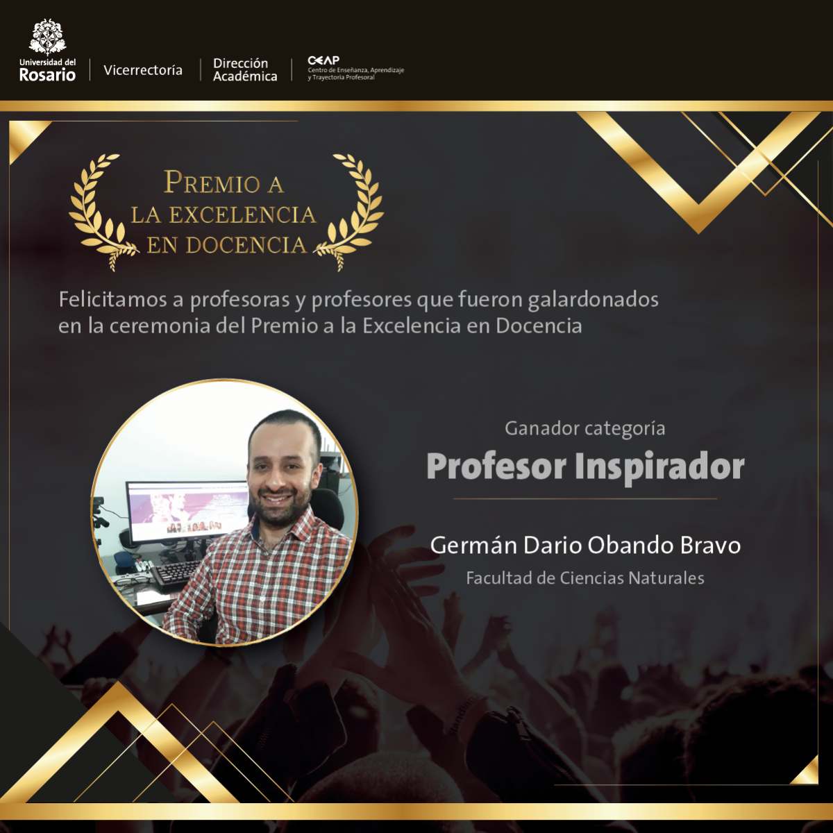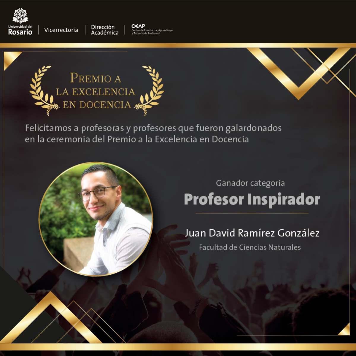En la categoría de Inspiración fueron 10 los profesores finalistas. Seis de ellos fueron los ganadores de la distinción: Juan Ramírez, profesor de la Facultad de Ciencias Naturales, sus estudiantes lo destacan como un profesor que dirige de una forma inspiradora, de calidad y con prácticas de enseñanza de gran utilidad en la formación como científicos. De la misma Facultad, Germán Obando obtuvo este reconocimiento por su metodología de estudio disruptiva y dinámica, que permite conectar situaciones cotidianas con los temas, logrando que en cada explicación los estudiantes quieran más la carrera.