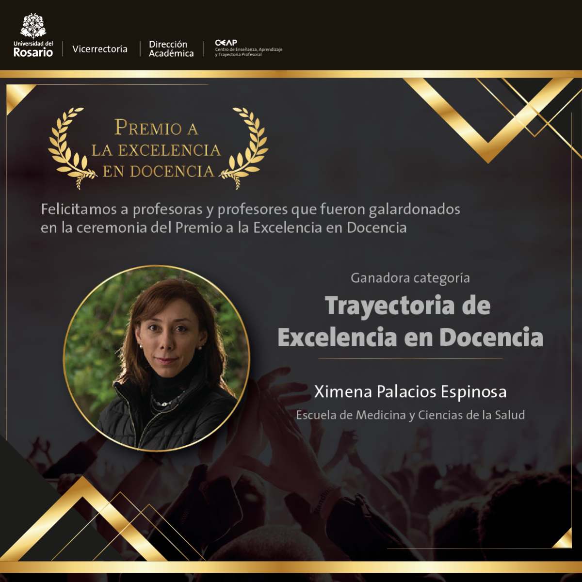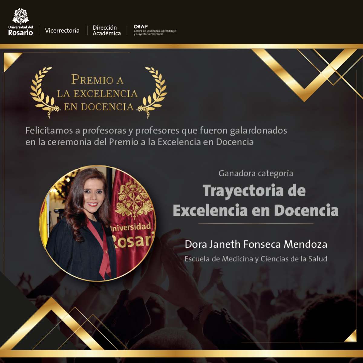 Finalizando la entrega de reconocimientos, se llevó a cabo el último momento que reconocía la Trayectoria de excelencia en Docencia. Premio otorgado a dos profesoras de la Escuela de Medicina y Ciencias de la Salud: Ximena Palacios, por su excelente rol como profesional y profesora, siempre preocupada porque sus estudiantes aprendan, logrando captar su atención de manera sencilla en temas profundos y complejos; y. Dora Fonseca por dar ejemplo en el uso de la investigación en sus clases, promover los recursos de la Universidad <,fomentar la curiosidad, responder dudas con gran destreza y pasión que se vuelve contagioso.