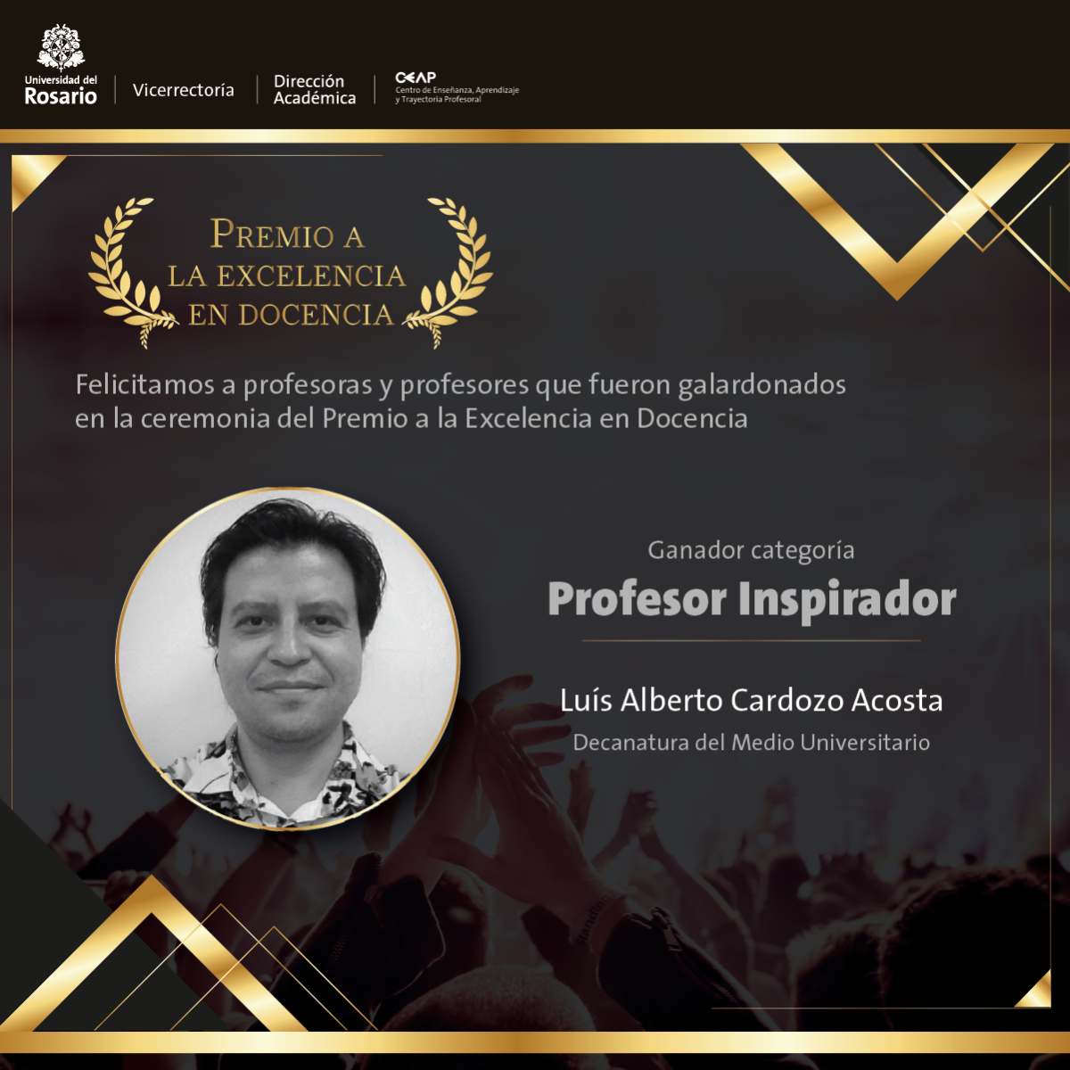 Oscar Palma, profesor de la Facultad de Estudios Internacionales, Políticos y Urbanos, fue otro de los acreedores de dicho reconocimiento por su direccionamiento como profesional y forma de hacer sus clases. Igualmente, Luis Cardozo, profesor de la Decanatura del Medio Universitario, fue distinguido por utilizar el arte para observar la realidad e inspirar en hacer más y mejor cada cosa en la que los estudiantes trabajan.