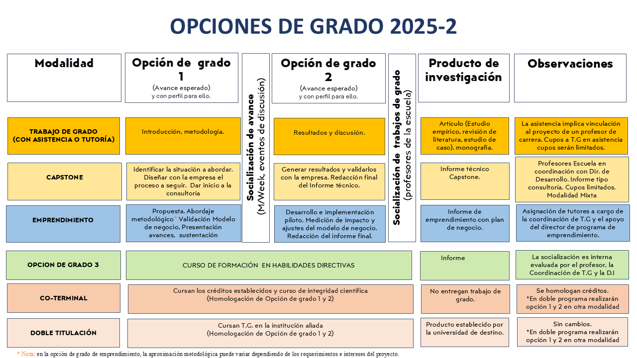 Opción de Grado 3 es un espacio de formación que pertenece al ciclo avanzado de los programas de pregrado de la escuela y es uno de los elementos del currículo que le permite al estudiante demostrar los aprendizajes adquiridos a lo largo de su formación para optar a su doble título.