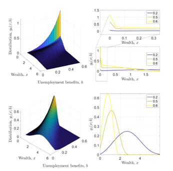 En la Figura 2 se representan las densidades g0 y g1 de la distribución de la riqueza de los desempleados y los trabajadores empleados y la dependencia de los cambios en la distribución estacionaria de la riqueza de la elasticidad de emparejamiento del desempleo y el beneficio de desempleo. Se observa que las fricciones de búsqueda y la tasa de sustitución producen cambios significativos en la distribución de la riqueza. En particular, a medida que aumenta b, también lo hace la concentración de desempleados en el límite de la deuda.