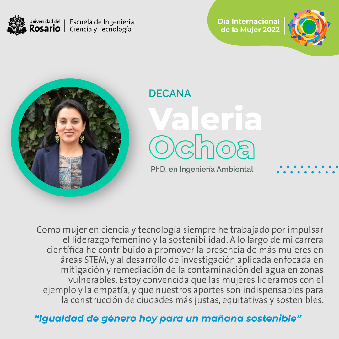 Como mujer en ciencia y tecnología siempre he trabajado por impulsar el liderazgo femenino y la sostenibilidad. A lo largo de mi carrera científica he contribuido a promover la presencia de más mujeres en áreas STEM, y al desarrollo de investigación aplicada enfocada en mitigación y remediación de la contaminación del agua en zonas vulnerables. Estoy convencida que las mujeres lideramos con el ejemplo y la empatía, y que nuestros aportes son indispensables para la construcción de ciudades más justas, equitativas, y sostenibles” Valeria Ochoa-Herrera, Decana de la Escuela de Ingeniería, Ciencia y Tecnología.