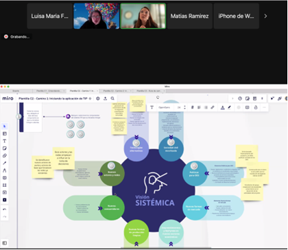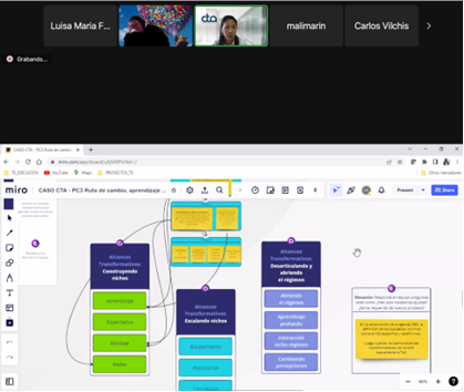 El Webinar se dividió en tres momentos principales, que corresponden a cada uno de los componentes. Los 3 momentos consistieron en la presentación del componente desde su teoría, luego, su aplicación en un ejemplo ilustrado en los tableros de la plataforma Miro y cerró con un espacio de preguntas y comentarios por parte de los asistentes.