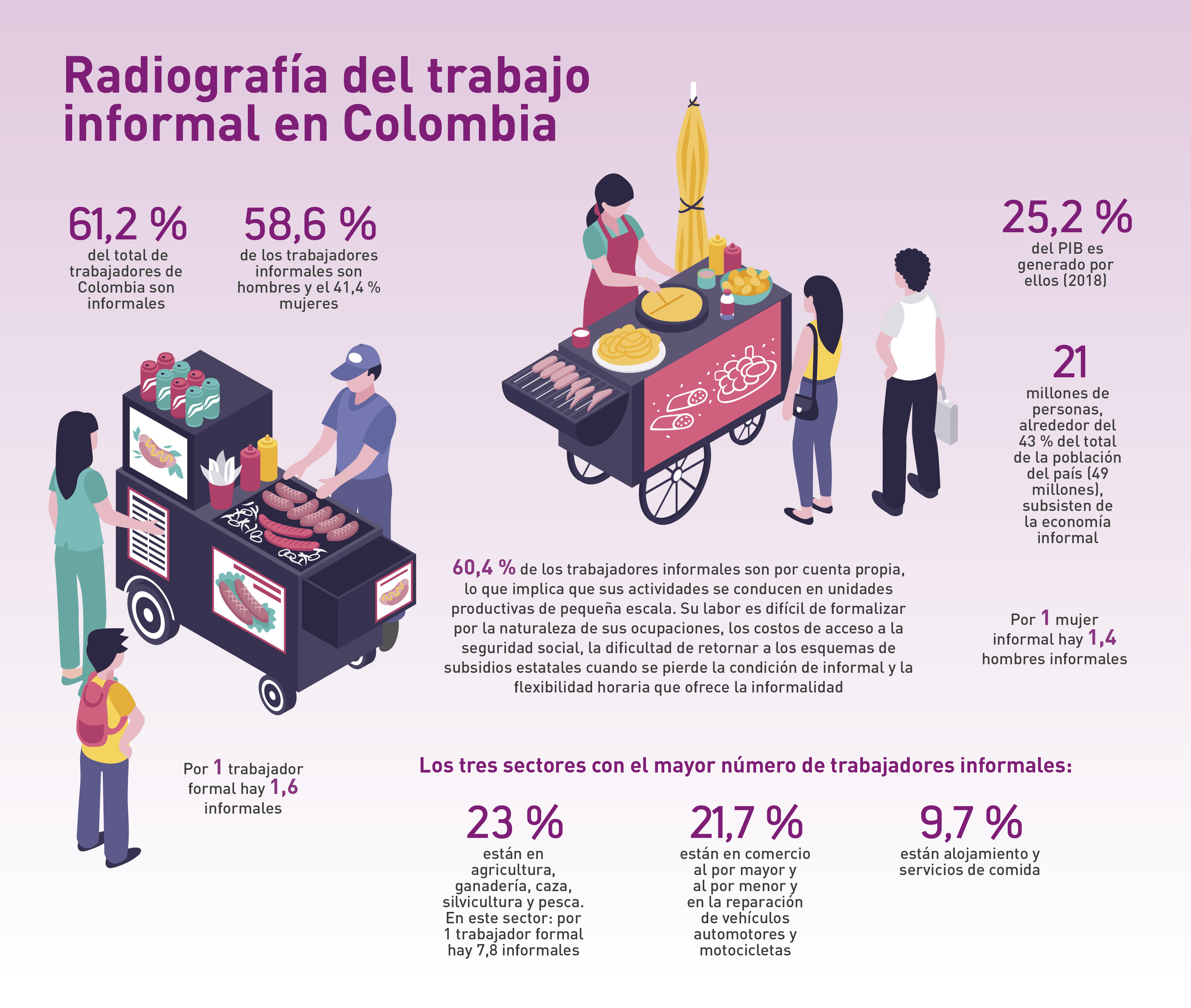 De esa manera, si se asume que los hogares de Colombia están compuestos por 3,2 personas aproximadamente, un total de 21 millones de personas (43 por ciento de la población) subsisten gracias a la economía informal. Se trata de una población con precariedades que pueden empeorar, ya que la informalidad tiene relación con el nivel de pobreza (medida en términos de ingresos) y este, a su vez, con la menor capacidad de respuesta para afrontar crisis. “Múltiples organizaciones internacionales han confirmado que hemos perdido los últimos 10 años de progreso en la eliminación de la pobreza monetaria”, explica Eslava. “Esto es gravísimo porque ya antes de la pandemia, en términos de ingresos, estábamos mal. Uno de los cálculos que hicimos en nuestro proyecto nos permitió concluir que, si tomamos los trabajadores informales en Colombia, más o menos el 76,6 por ciento tiene ingresos menores de diez dólares por día. Diez dólares es la base que han utilizado organismos internacionales como el Banco Mundial para determinar cuánto es necesario para vivir una vida digna en el siglo XXI. Y si vamos al nivel de pobreza extrema, que es 1,90 dólares por día, el 16 por ciento de los trabajadores informales gana menos de eso. Estamos hablando así de un sector de grupo poblacional muy grande, en su mayoría muy pobre o en camino de ser extremadamente pobre. Este es uno de los retos más difíciles que hoy tiene Colombia. Un reto compartido por muchos países en la misma situación”.