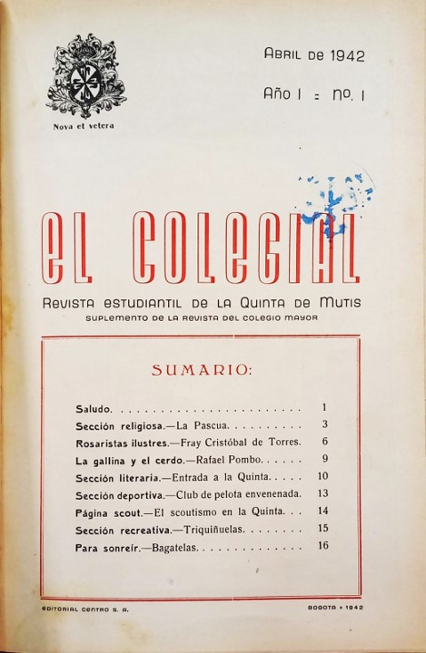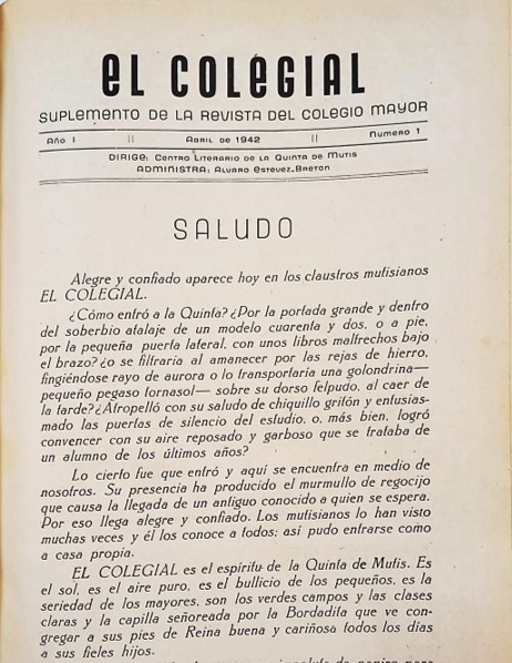En abril de 1942 salió publicado el número 1 del año 1 de El Colegial, Revista estudiantil de la Quinta de Mutis, suplemento de la Revista del Colegio Mayor. El pie de imprenta decía “Editorial Centro S. A.”. En la tapa posterior informaba que “aparece el 1.o de cada mes”. El número suelto se conseguía por $ 0,05 y los avisos iban de $ 1 a 5. La tarifa de publicación de fotografías era de $ 3. El ejemplar constaba de dieciséis páginas (a veces 20, 24, 36), con numeración continua. El primer volumen de la revista reúne sus primeros siete años de labores, 1942-47, y los primeros veinte números. El equipo encargado de El Colegial, en su primer número, era así: “Dirige: Centro literario de la Quinta de Mutis – Administra: Álvaro Estévez-Bretón[1]”.