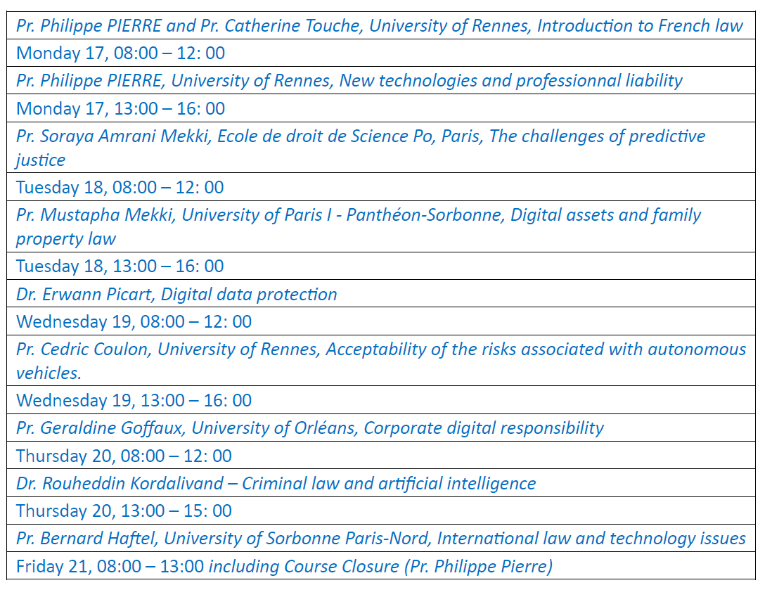 A través de esta misión, el estudiante podrá examinar las diversas cuestiones que plantea la aceptabilidad jurídica de las nuevas tecnologías y su integración en las normas jurídicas y otras fuentes de derecho. Contenidos como el derecho francés, incluida la jerarquía de las normas, las instituciones jurisdiccionales y las ramas del Derecho Público y Privado serán relevantes para comprender la manera en la que ha evolucionado las leyes y su impacto actual. Se examinará el impacto de las nuevas tecnologías en la responsabilidad de profesionales como notarios, abogados y proveedores de productos a través del prisma de las empresas que deben adaptar éticamente su forma de desarrollar, desplegar y utilizar las tecnologías digitales.